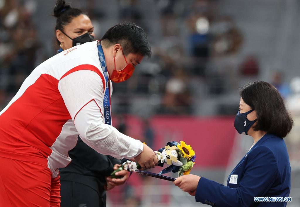Gong Lijiao of China reacts during the awarding ceremony of the Women's Shot Put at the Tokyo 2020 Olympic Games in Tokyo, Japan, Aug. 1, 2021. (Xinhua/Li Yibo)