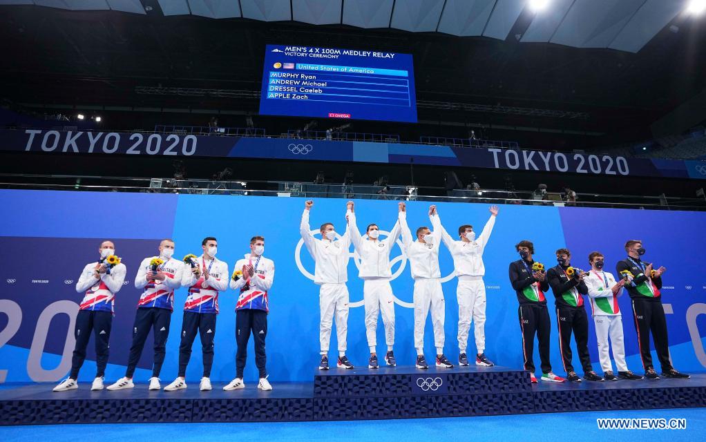 Gold medalist of the United States, silver medalists of Great Britain and bronze medalists of Italy pose during the awarding ceremony after the men's 4X100m medley relay final of swimming at the Tokyo 2020 Olympic Games in Tokyo, Japan, Aug. 1, 2021. (Xinhua/Xu Chang)