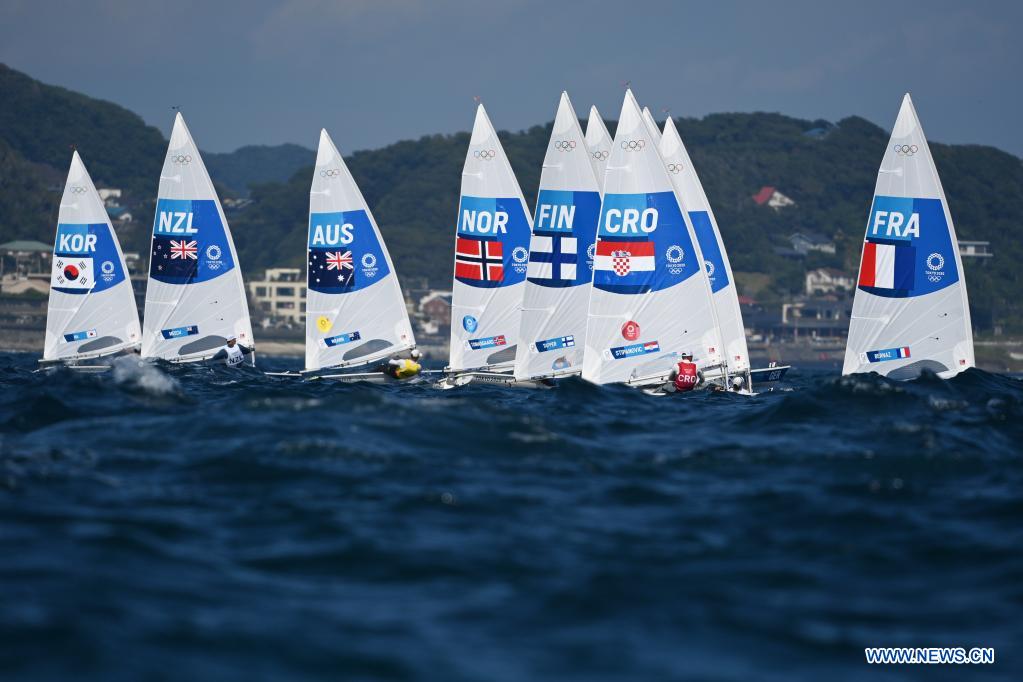 Athletes compete during the sailing men's one person dinghy laser medal race at the Tokyo 2020 Olympic Games in Kanagawa, Japan, Aug. 1, 2021. (Xinhua/Huang Zongzhi)