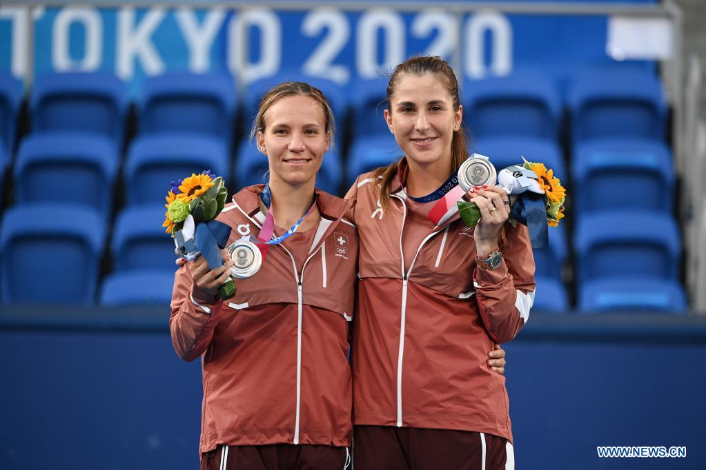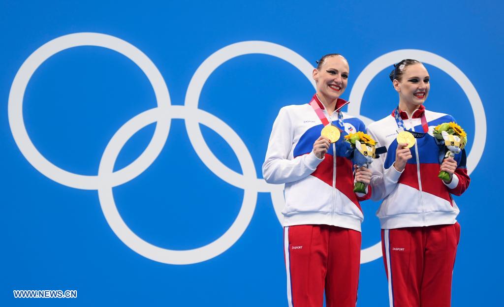 Photo taken on Aug. 1, 2021 shows the awarding ceremony for the women's 3m springboard final of diving at Tokyo 2020 Olympic Games in Tokyo, Japan. (Xinhua/Wang Jingqiang)