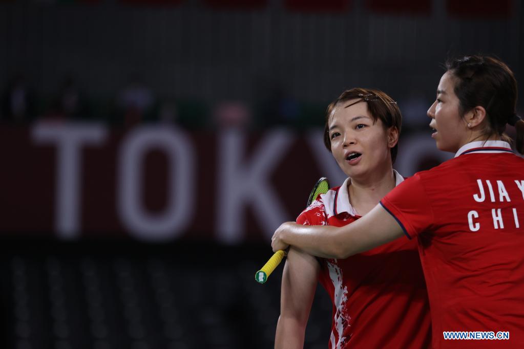 Wang Han (L), Shi Tingmao of China react after the awarding ceremony for the women's 3m springboard final of diving at Tokyo 2020 Olympic Games in Tokyo, Japan, Aug. 1, 2021. (Xinhua/Wang Jingqiang)