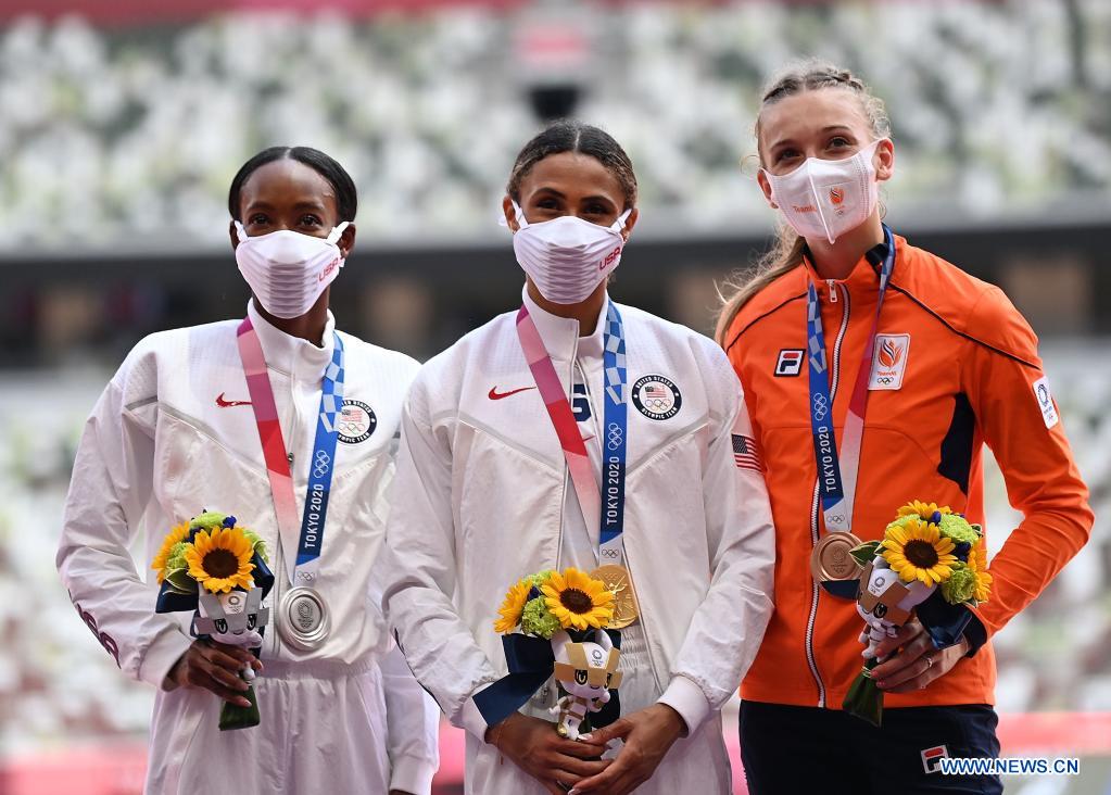Gold medalist Gong Lijiao (C) of China, silver medalist Raven Saunders (L) of the United States and bronze medalist Valerie Adams of New Zealand react during the awarding ceremony of the Women's Shot Put at the Tokyo 2020 Olympic Games in Tokyo, Japan, Aug. 1, 2021. (Xinhua/Ju Huanzong)