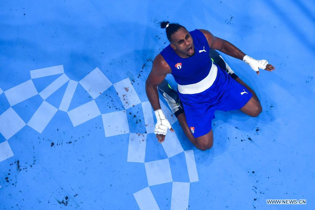 Gong Lijiao of China celebrates during the women's shot put final at Tokyo 2020 Olympic Games, in Tokyo, Japan, Aug 1, 2021. (Xinhua/Wang Lili)
