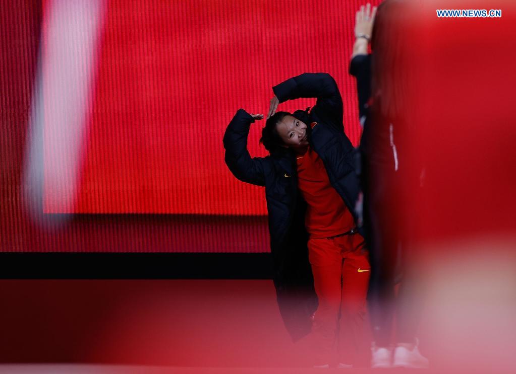 Lyu Xiaojun of China gestures during the awarding ceremony. (Xinhua/Yang Lei)