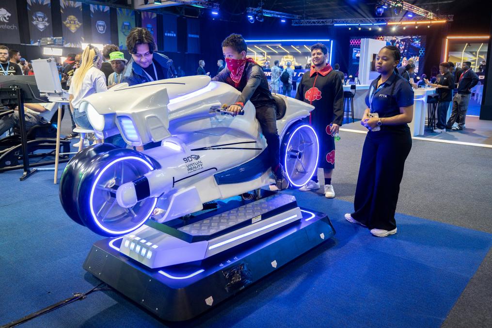 8月28日,一名男孩在南非约翰内斯堡举行的非洲动漫展上体验游戏设备。