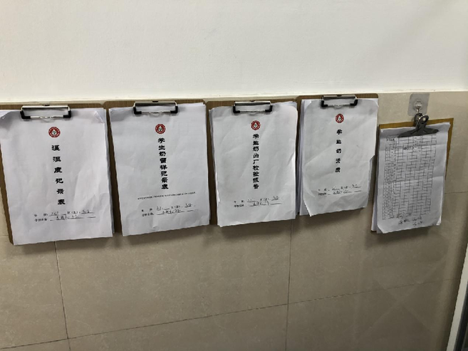 在這些學校的儲藏室里,學生奶都按照產品底層墊托板、四周離墻、離地15cm以上等嚴格要求擺放儲存。學校的墻上還掛著關于學生奶的儲存、領取與分發、不適反應處理流程等規章制度。