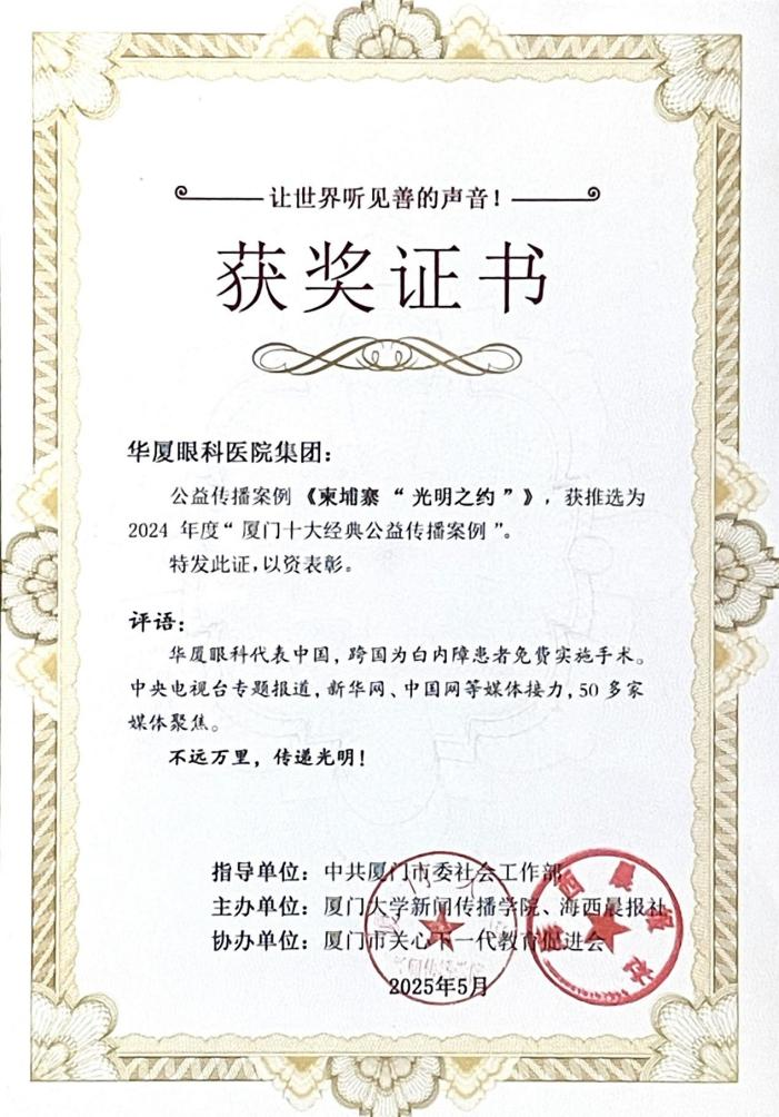5月30日下午,由中共厦门市委社会工作部指导,厦门大学新闻传播学院、海西晨报社发起主办,厦门市关心下一代教育促进会协办的2024年度“厦门十大经典公益传播案例”发布仪式在厦门大学科学艺术中心举行。华厦眼科柬埔寨光明行公益项目,凭借显著的公益成效以及广泛的传播影响力,以第一名的优异成绩,获评2024年度“厦门十大经典公益传播案例”。