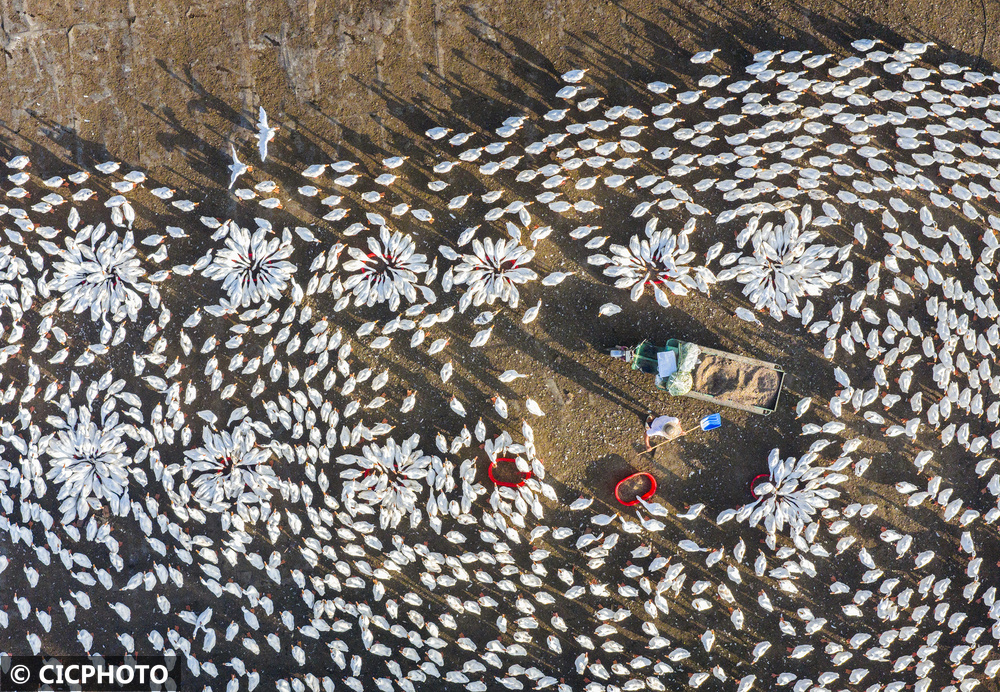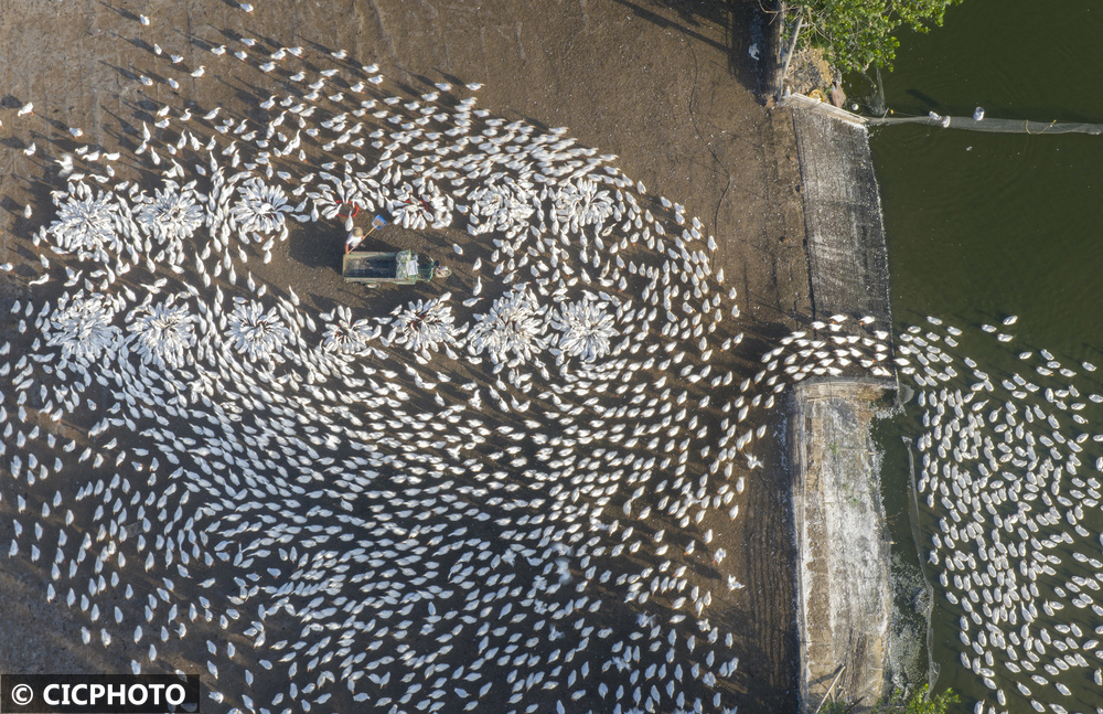 2025年7月12日,江苏省宿迁市泗洪县石集乡一生态鹅养殖基地生机盎然,工作人员正忙着投放饲料。近年来,石集乡依托滩涂等自然资源大力发展生态养殖,既盘活了闲置资源,又通过规模化养殖带动农户增收。