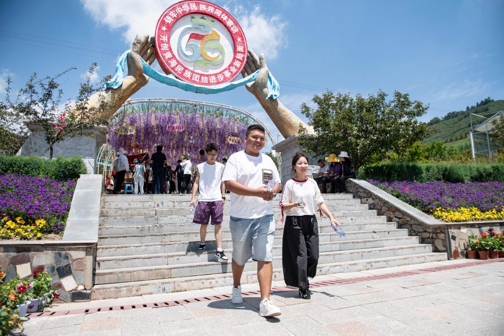 7月22日,在大通县边麻沟花海景区,工作人员与一名同家人来游玩的小朋友互动。