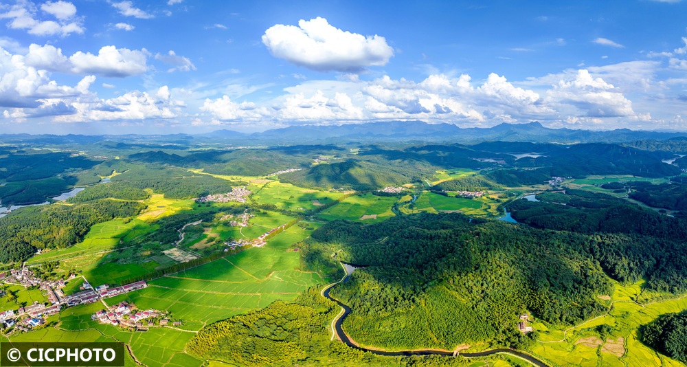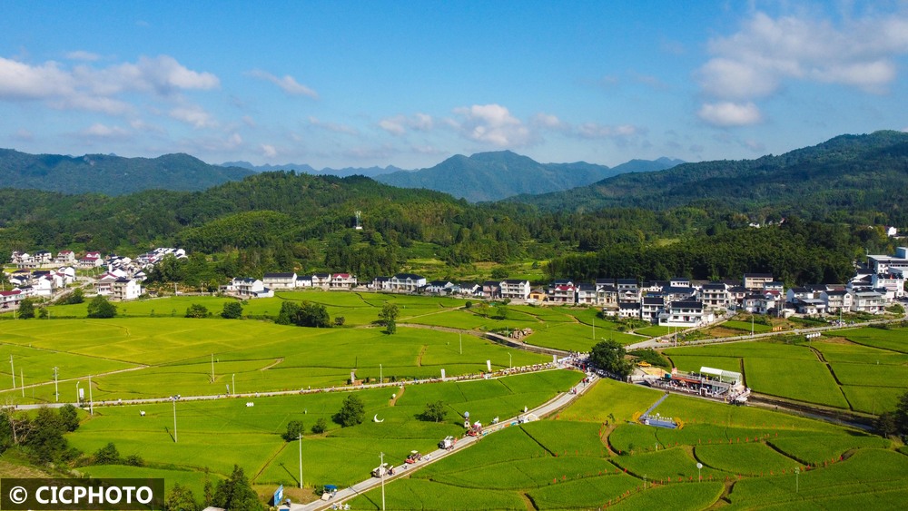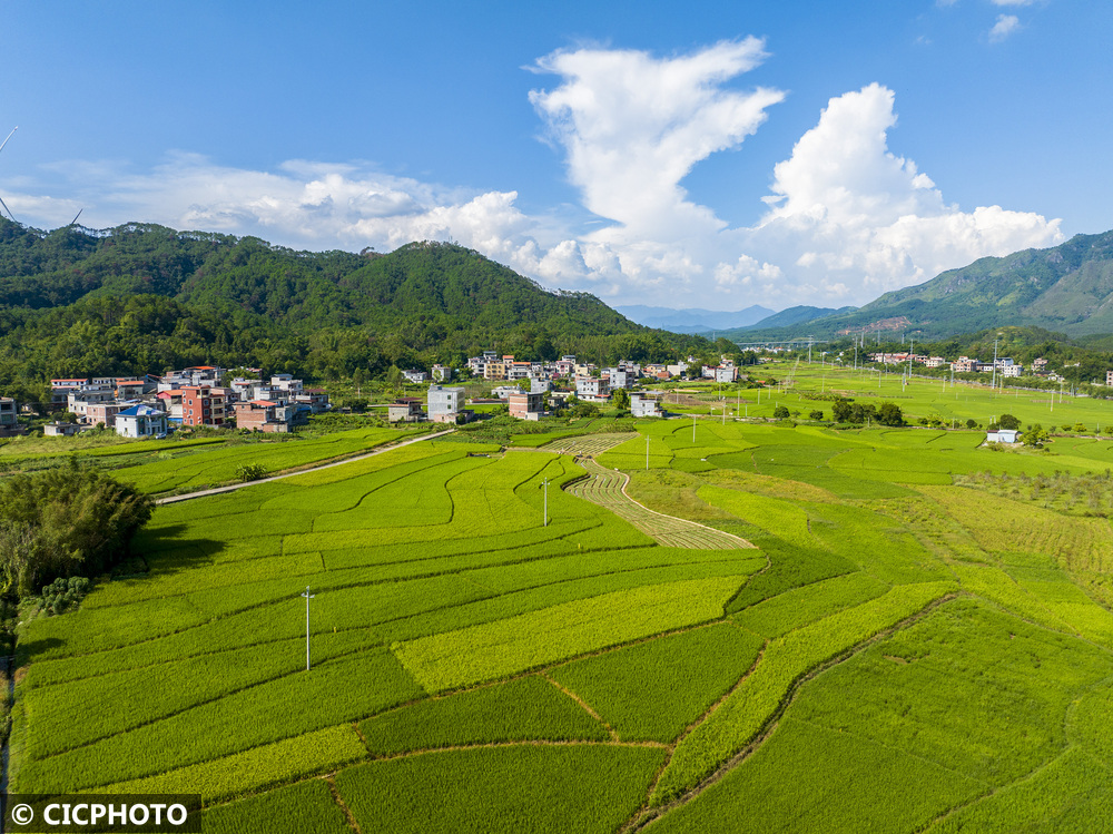 秋高气爽,各地村庄和田园在蓝天白云映衬下景美如画。
