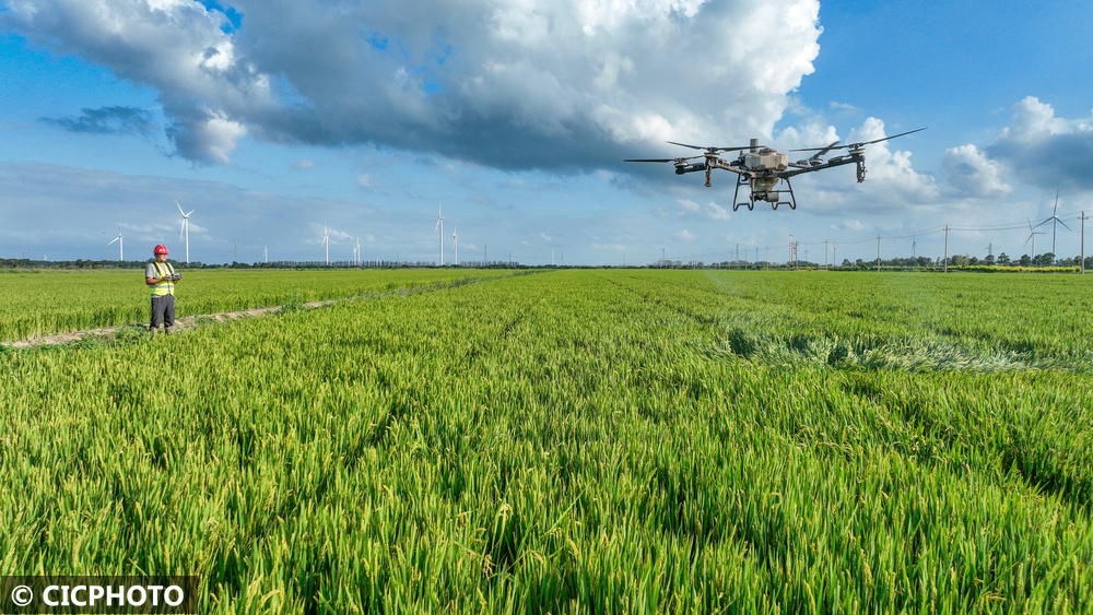 ↑2025年9月22日,在位于江苏省盐城市射阳县的江苏农垦新洋农场,农技人员操作搭载北斗导航系统的植保无人机在稻田作业。(无人机照片)CICPHOTO/张伟生 摄