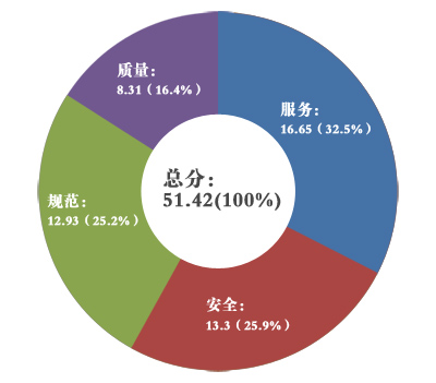 3、通過問卷調查結果分析,金隅項目總分共51.42,其中服務占總比例32.50%,安全占總比例25.90%,規范占總比例25.20%,質量占總比例16.40%。