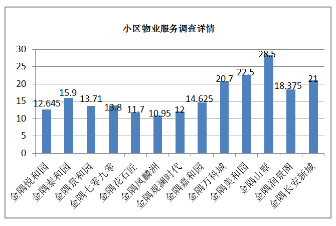 由上圖顯示,在目前的物業服務調查過程中,,有金隅項目得分最高,為28.5分,金隅觀瀾時代得分最低,為12分。