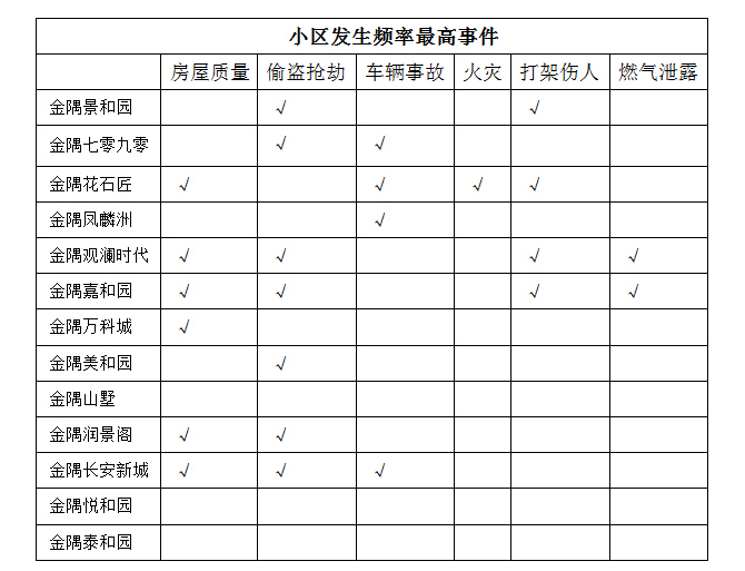 根據上述兩個表格發現,整體來看,金隅各小區安全隱患較多,13個項目中共10個項目存在安全隱患,占77%。其中偷盜搶劫比例最多,占54%,其次為房屋質量,占46%,項目中金隅花石匠、金隅觀瀾時代、金隅嘉和園三個項目問題比較多。
