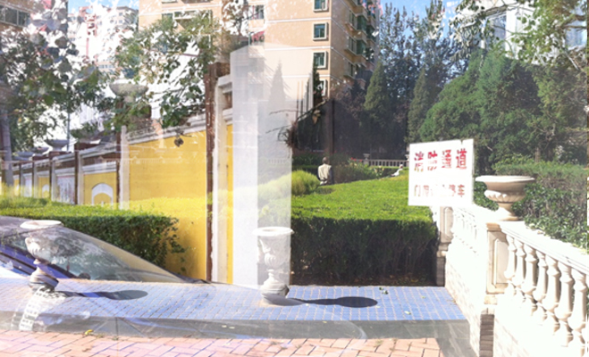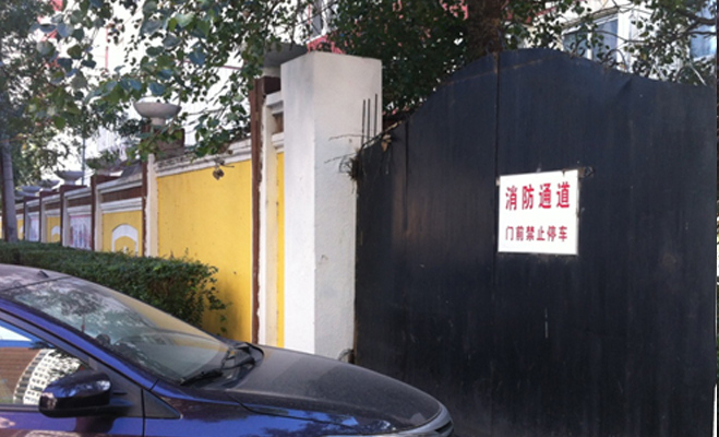記者跟隨業主從東門進入小區,迎面看到掛有疏散通道的條幅,但疏散通道似乎被車輛占據。而小區外面的消防通道門前也寫明了不許停車,但此警告語并沒有用處,門前依舊停有車輛。小區東門有保安,業主需刷卡進入,小區北門有車輛的門禁,但沒有設業主門禁,這與中海其他盤嚴密的門禁制度不符。
