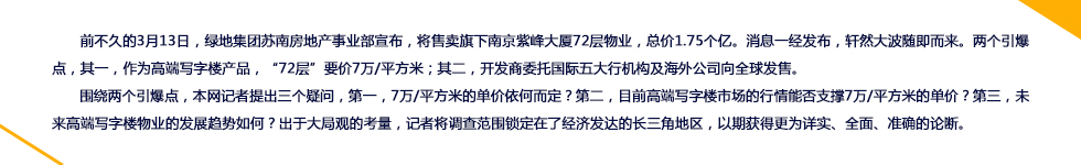 宏觀來看,截止到2013年年底,南京甲級寫字樓存量達到了128.9萬平方米,是上海的1/5。但沈潔從中長期來看,持謹慎態度,她認為,在2015-2016年寫字樓新增供應高峰到來后,上海寫字樓市場的增長趨勢將逐漸減緩,且勢頭將不斷加速。南京則不同,沈潔指出,“供不應求”是近兩年的普遍情況,伴隨著經濟的不斷發展,高端寫字樓的需求量會逐年遞增,“我們預判,南京甲級寫字樓市場將持續穩定向上的態勢。”…[ 詳細] |