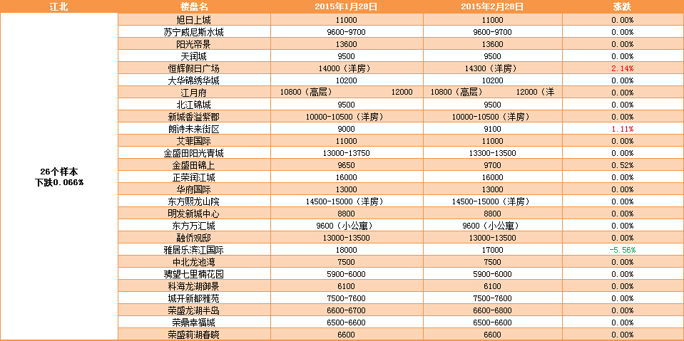 新華房產(chǎn)記者統(tǒng)計(jì)發(fā)現(xiàn),2015年2月南京樓市八大板塊中,江寧、河西、城東房價(jià)上漲,江北房價(jià)下跌,其余板塊房價(jià)無變動(dòng)。 綜合結(jié)果,2月房價(jià)環(huán)比微漲0.12%。 [詳細(xì)]