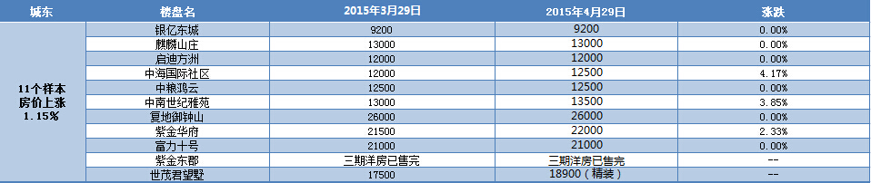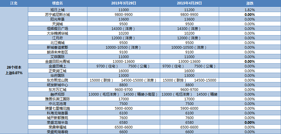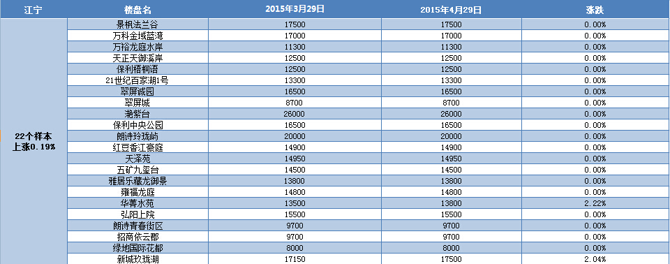 近日,新華房產通過對南京八大板塊在售的127家樓盤進行了房價漲跌統計,結果發現,4月,南京房價環比微漲0.22%。其中,仙林、城東、江寧、江北房價出現了不同程度的漲幅,其余板塊房價持平。 [詳細]