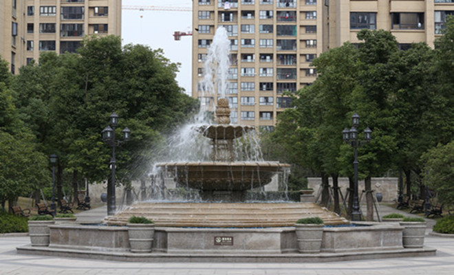 小區內綠化布置以生態、綠色為先導,充分利用其樓間距的距離,形成縱深交錯,層層合圍的平面布局。一路走來,花卉植物、雕像噴泉、卵石路徑,滿目皆是。