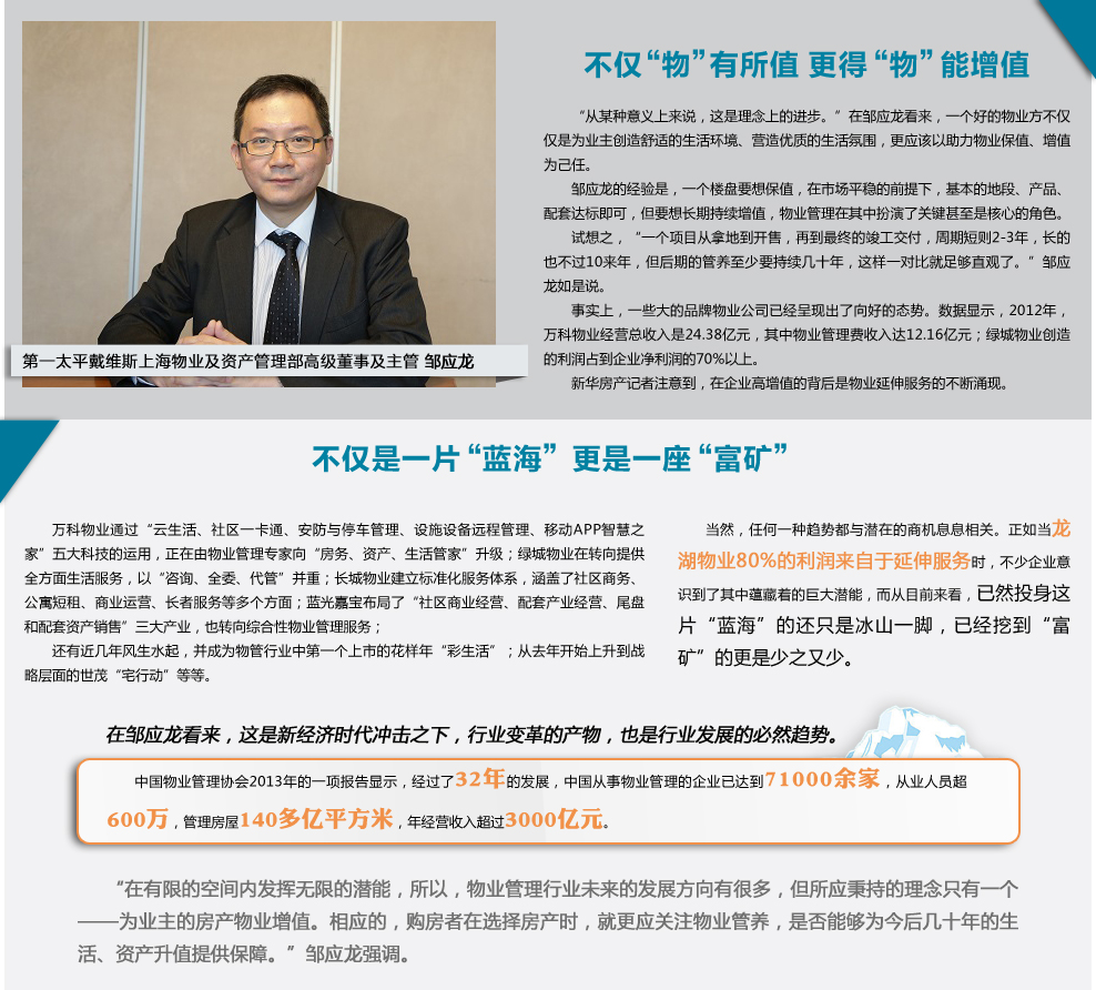 另一家龍頭房企保利地產(chǎn),則是把部隊大院的管理模式應(yīng)用到物業(yè)管理模式當(dāng)中。“在物業(yè)管理上,保利強調(diào)部隊大院的文化、和諧的文化,打造‘親情和院’的物業(yè)品牌。”[詳細(xì)]
