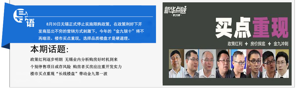 一年一度的“金九銀十”又將拉開戰幕,作為傳統旺季,“金九銀十”向來是“兵家必爭之地”。為了提高營業額、增加市場占有率,開發商必然使出渾身解數,動作頻頻。再加上8月末無錫限購令已經解除,眾多業內人士均表示在政策利好的條件下無錫樓市極有可能再度得到提振。