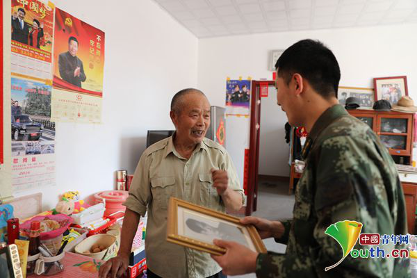 ????孟曉暉的爺爺孟慶欣也曾經(jīng)是一名解放軍戰(zhàn)士,并榮獲過獨立獎章。每當說起自己的從軍經(jīng)歷時,這位年過八旬的老人都十分振奮,談到繼承了“紅色基因”的兒孫時,孟慶欣老人的驕傲與自豪更是溢于言表。他說,自己經(jīng)常把當年參軍的故事講給子孫聽,曉暉就是聽著爺爺?shù)墓适麻L大的,從小就說自己長大后也要當兵。在唱起這首凝聚了他熱血青春與報國壯志的軍歌之前,老人嚴肅地說道:“我要換上一身整潔的軍裝!”