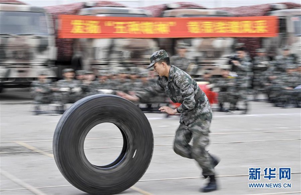 5月6日,沈陽聯(lián)勤保障中心某汽車運輸旅一營戰(zhàn)士在軍體比武上進(jìn)行滾輪胎接力賽。新華社記者 許暢 攝
