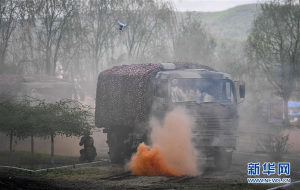 5月6日,沈陽聯(lián)勤保障中心某汽車運輸旅一營戰(zhàn)士進(jìn)行無人機(jī)處突演練。新華社記者 許暢 攝