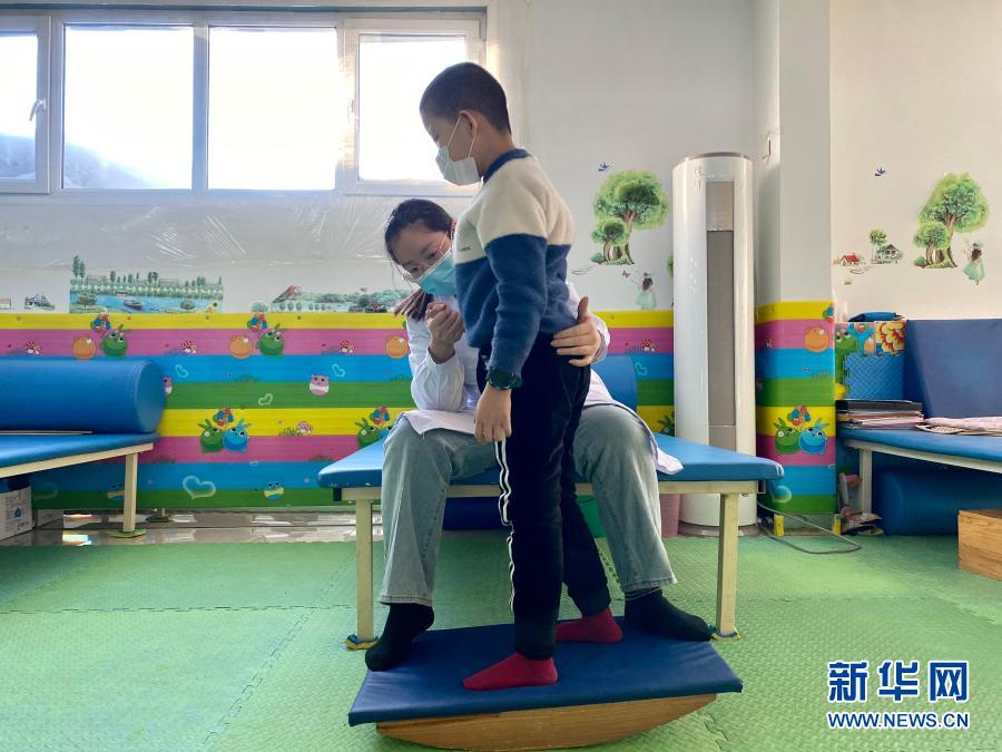 在哈爾濱博能中醫門診部,劉雨晴為腦癱兒童進行康復訓練(2月2日攝,手機照片)。