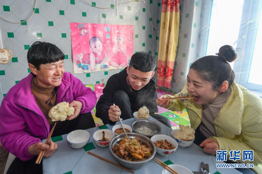 2月9日,在吉林省長春市農安縣楊樹林鄉牛尾巴山村,付寶印的母親鐘士輝(左)與付寶印的姐姐付寶賀(右)、外甥趙天寶(中)吃飯。新華社記者 張楠 攝