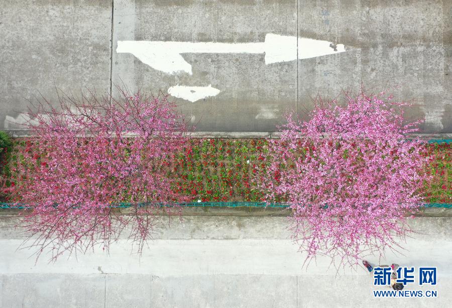 浙江景寧畬族自治縣街頭梅花盛開(2月14日攝,無人機照片)。新華社發(李肅人 攝)