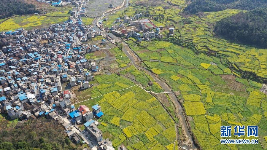2月14日在貴州省黔東南苗族侗族自治州黎平縣拍攝的油菜花田(無(wú)人機(jī)照片)。新華社發(fā)(李長(zhǎng)華 攝)