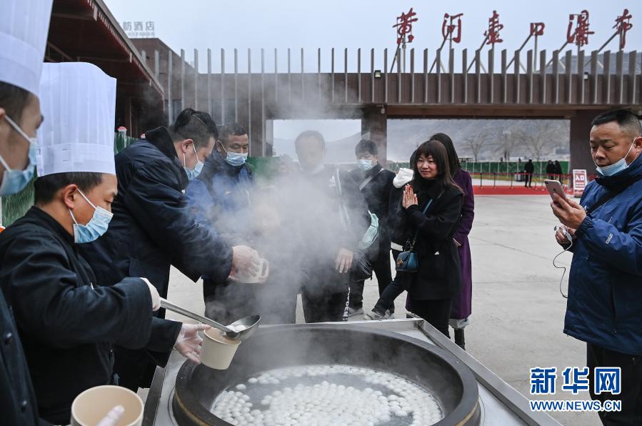 2月24日,陜西壺口瀑布景區工作人員(前左)為游客送上免費的湯圓。