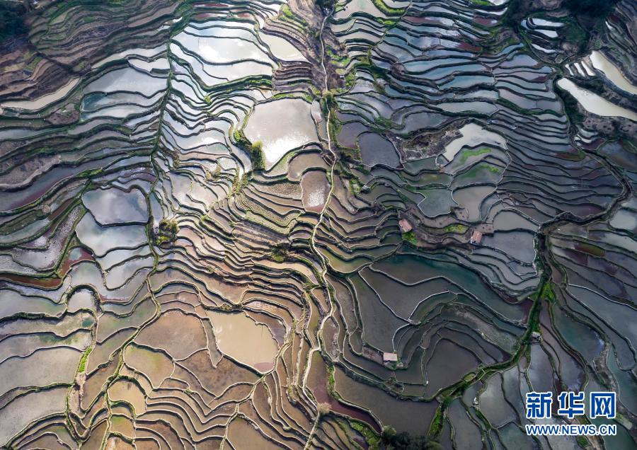 春日里,位于云南省紅河哈尼族彝族自治州元陽縣境內的哈尼梯田在不同光照條件下呈現出豐富色彩,與周邊村寨、山系等和諧相融,猶如一幅幅色彩斑斕的油畫,美不勝收。