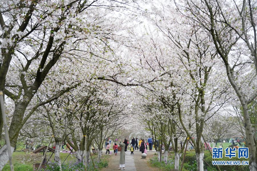3月20日,游人在江西省南昌縣鳳凰溝景區(qū)觀賞盛開的櫻花。