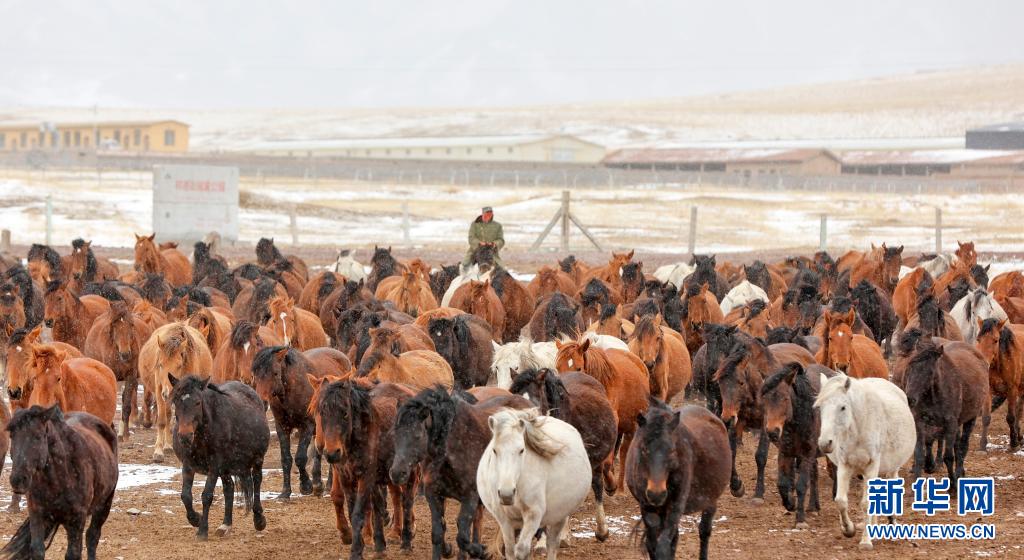 當日,受冷空氣影響,位于甘肅省河西走廊中部、祁連山北麓的山丹馬場降雪,馬群在雪原上奔跑覓食,構成了一幅壯美高原雪景 。