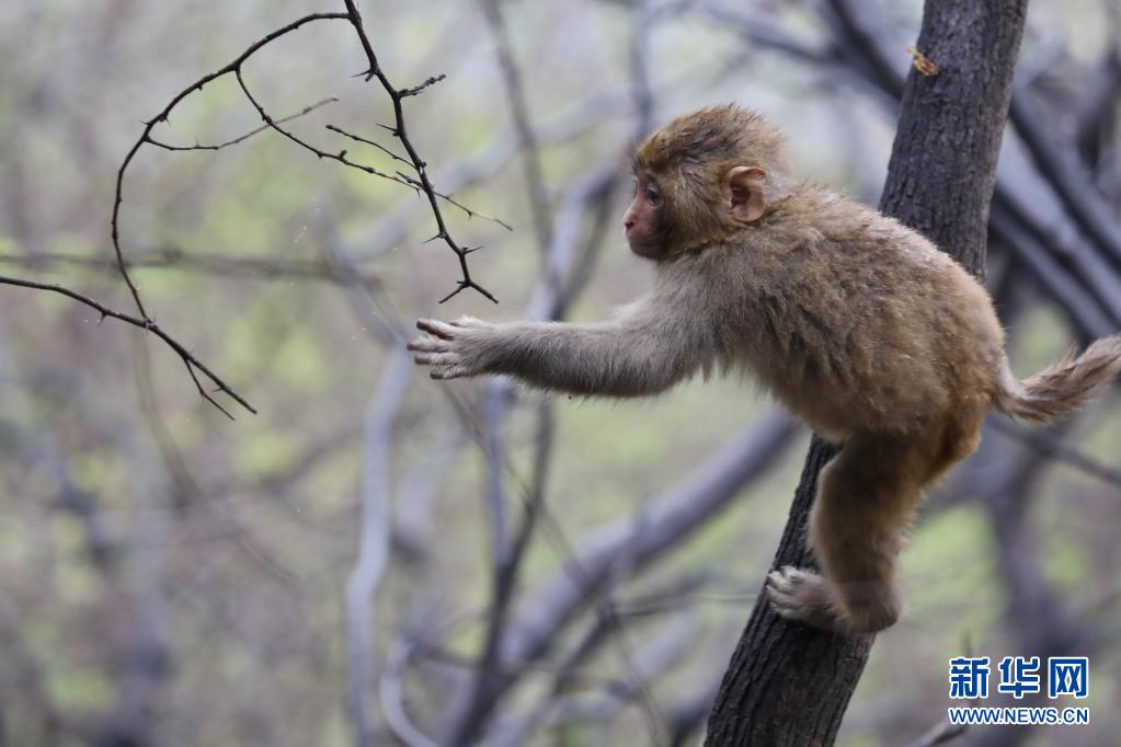 4月3日,在神農山風景區,一只野生太行獼猴在樹上嬉戲。隨著氣溫回暖,河南省沁陽市神農山風景區野生太行獼猴活躍起來,在山林間嬉戲玩鬧,為景區增添生機和靈氣。新華社發(徐宏星 攝)
