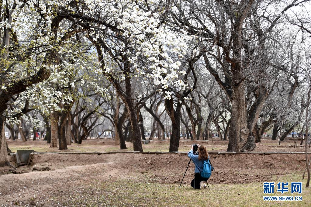 4月3日,游客在中衛市南長灘村拍攝盛開的梨花。