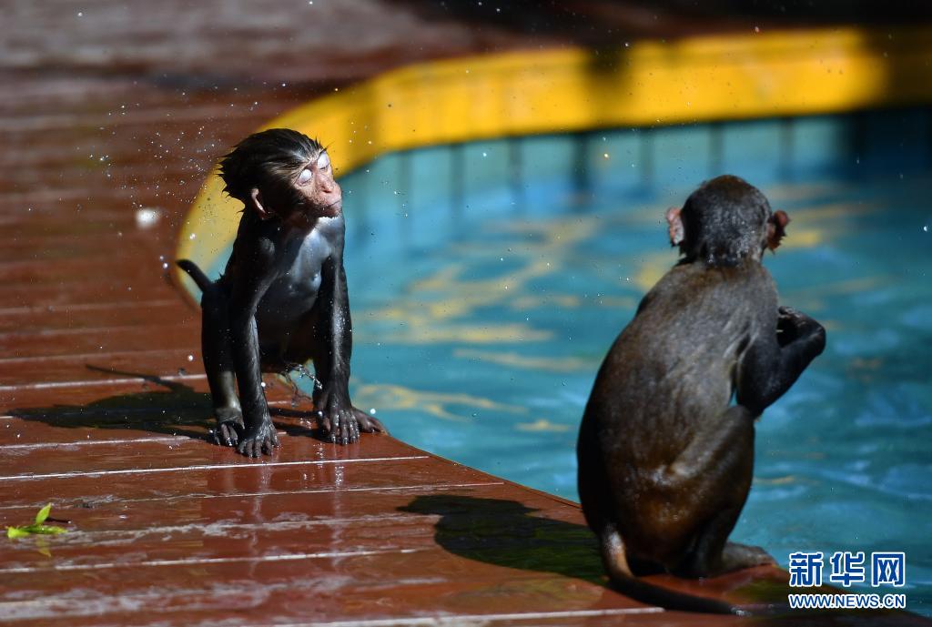 4月4日,南灣猴島保護區里的獼猴在上岸后甩去身上的水。