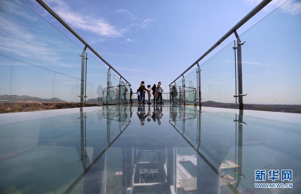4月5日,游客在山東省臨沂市沂南縣紅石寨景區內體驗高空玻璃棧道。