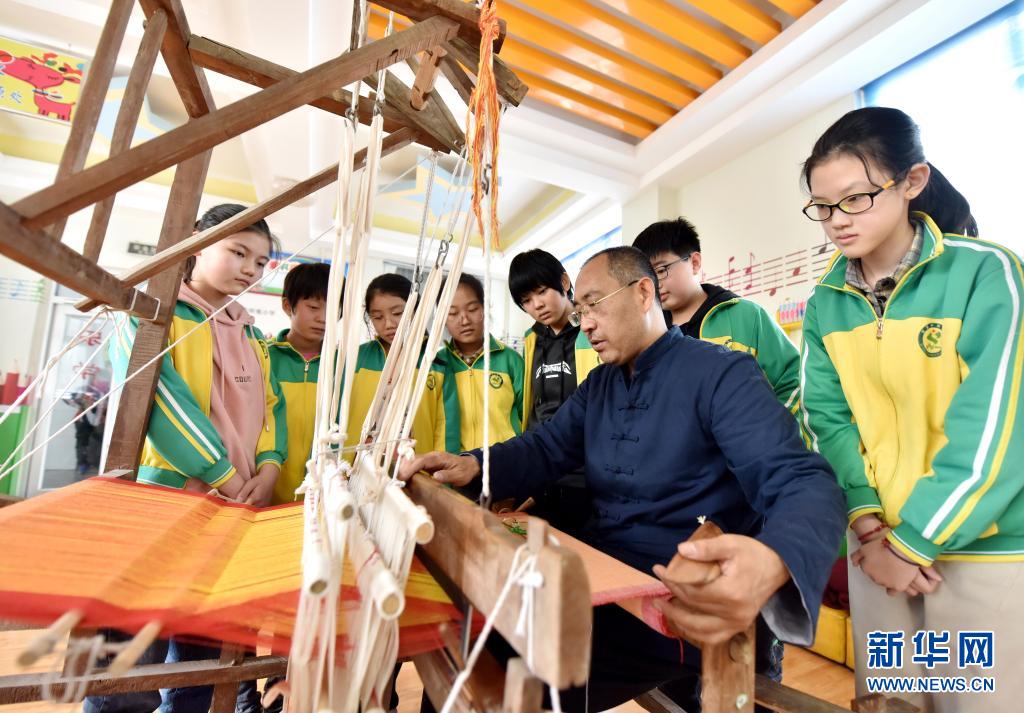 4月7日,威縣土布紡織技藝傳承人高慶海在威縣第四小學向學生演示老粗布紡織技藝。近年來,河北省邢臺市威縣積極開展“非遺傳承進校園”活動,將當地特色非遺項目引入學校課堂,讓學生近距離感受民間傳統技藝的魅力,促進非遺文化的保護和傳承。新華社記者 朱旭東 攝