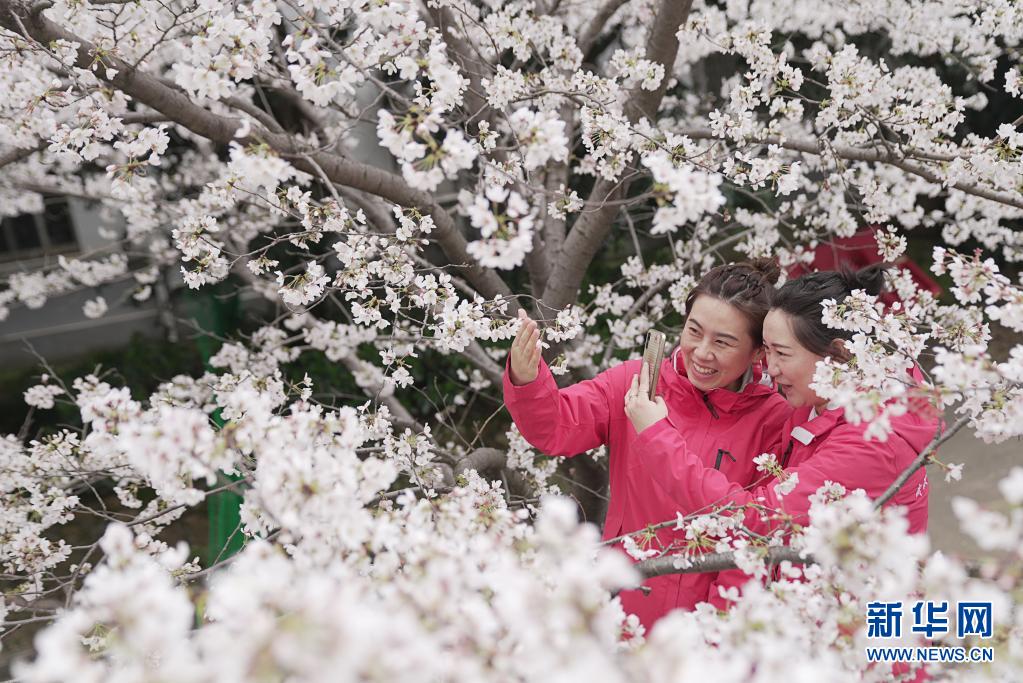 3月13日,武漢雷神山醫(yī)院醫(yī)護(hù)人員在櫻花樹下賞花。當(dāng)日,武漢大學(xué)抗疫醫(yī)護(hù)人員賞櫻專場啟動,來自全國各地的援鄂抗疫英雄在櫻花樹下重逢,盡享櫻花之約。新華社記者 熊琦 攝
