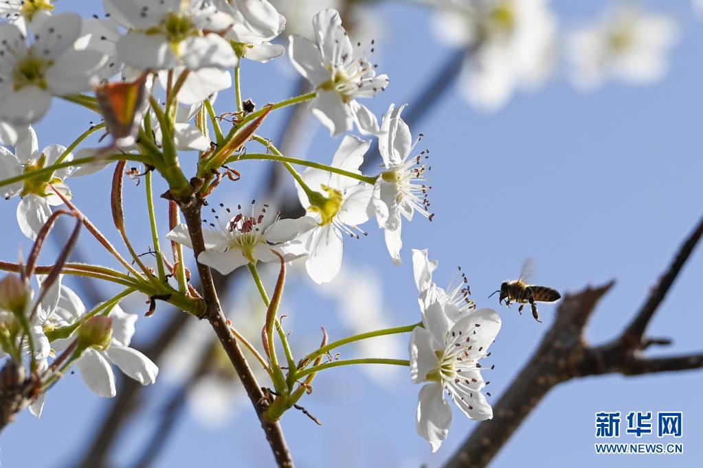 4月11日,在鐵門關市一處梨園,蜜蜂在授粉。新華社記者 丁磊 攝