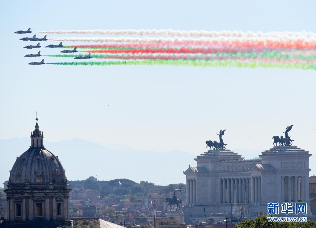 4月25日,意大利“三色箭”飛行表演隊(duì)在羅馬舉行的紀(jì)念儀式上噴出代表意大利國旗顏色的紅白綠三色煙霧。