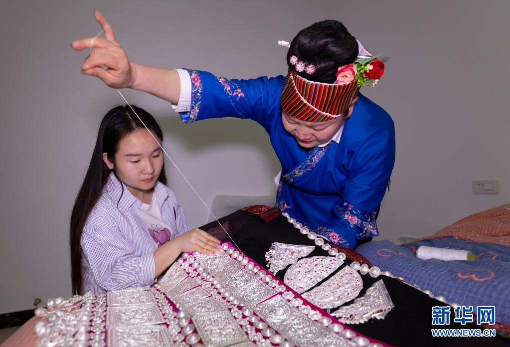 張佳麗(左)和母親張元英整理苗族盛裝(4月24日攝)。
