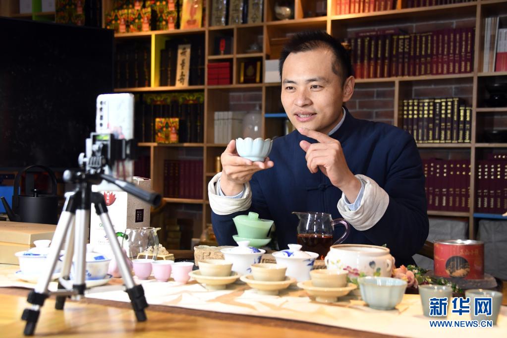 李卓澄在“小茶館”中通過視頻直播的方式向觀眾介紹茶具知識(4月29日攝)。新華社記者 任超 攝