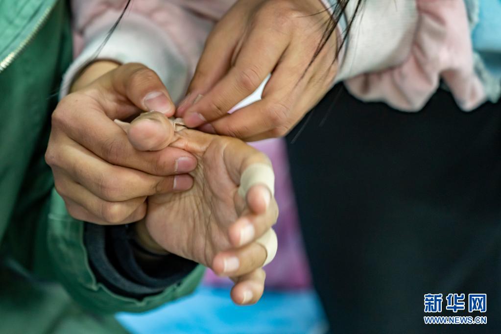 每天回到福利院,孩子們都會幫張桂梅撕掉貼了一天的止痛膠帶(3月23日攝)。新華社記者 江文耀 攝