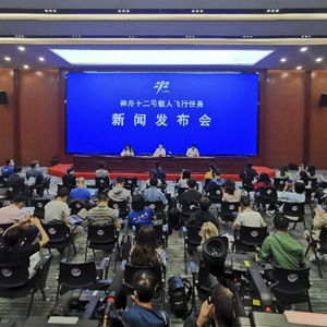 6月16日,神舟十二號載人飛行任務新聞發布會在酒泉衛星發射中心召開(手機拍攝)。