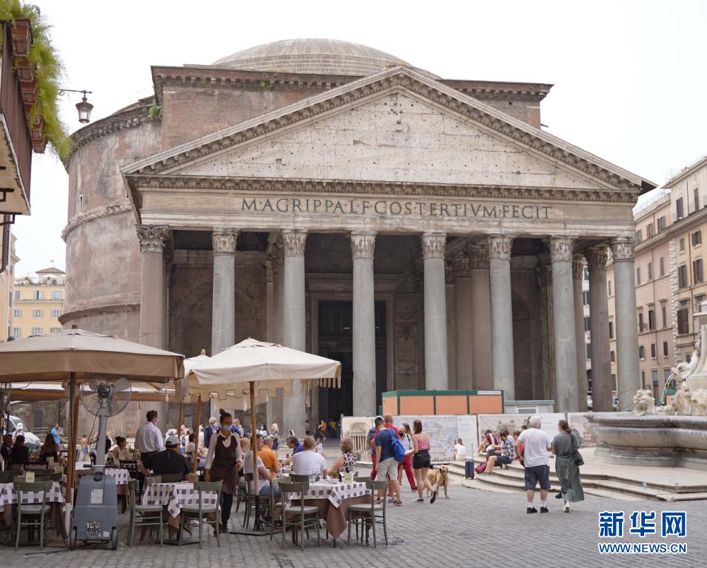 6月24日,人們在意大利羅馬萬神殿前一家餐館的戶外區(qū)域消費。