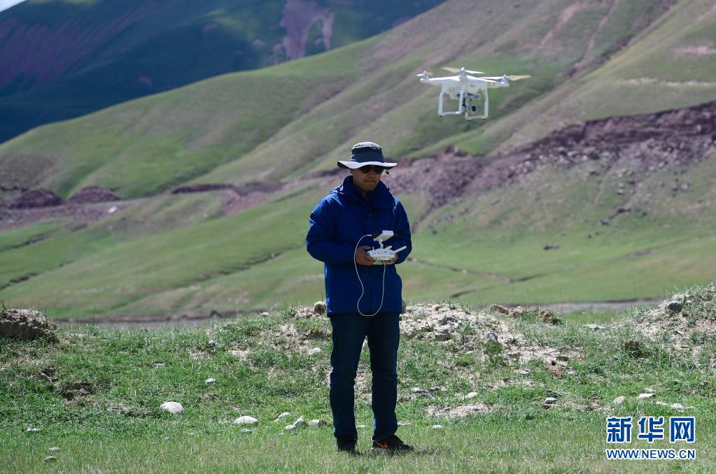 2021年長(zhǎng)江源綜合科考的科考隊(duì)員趙保成在使用無(wú)人機(jī)觀(guān)測(cè)長(zhǎng)江源地區(qū)生態(tài)環(huán)境(7月24日攝)。